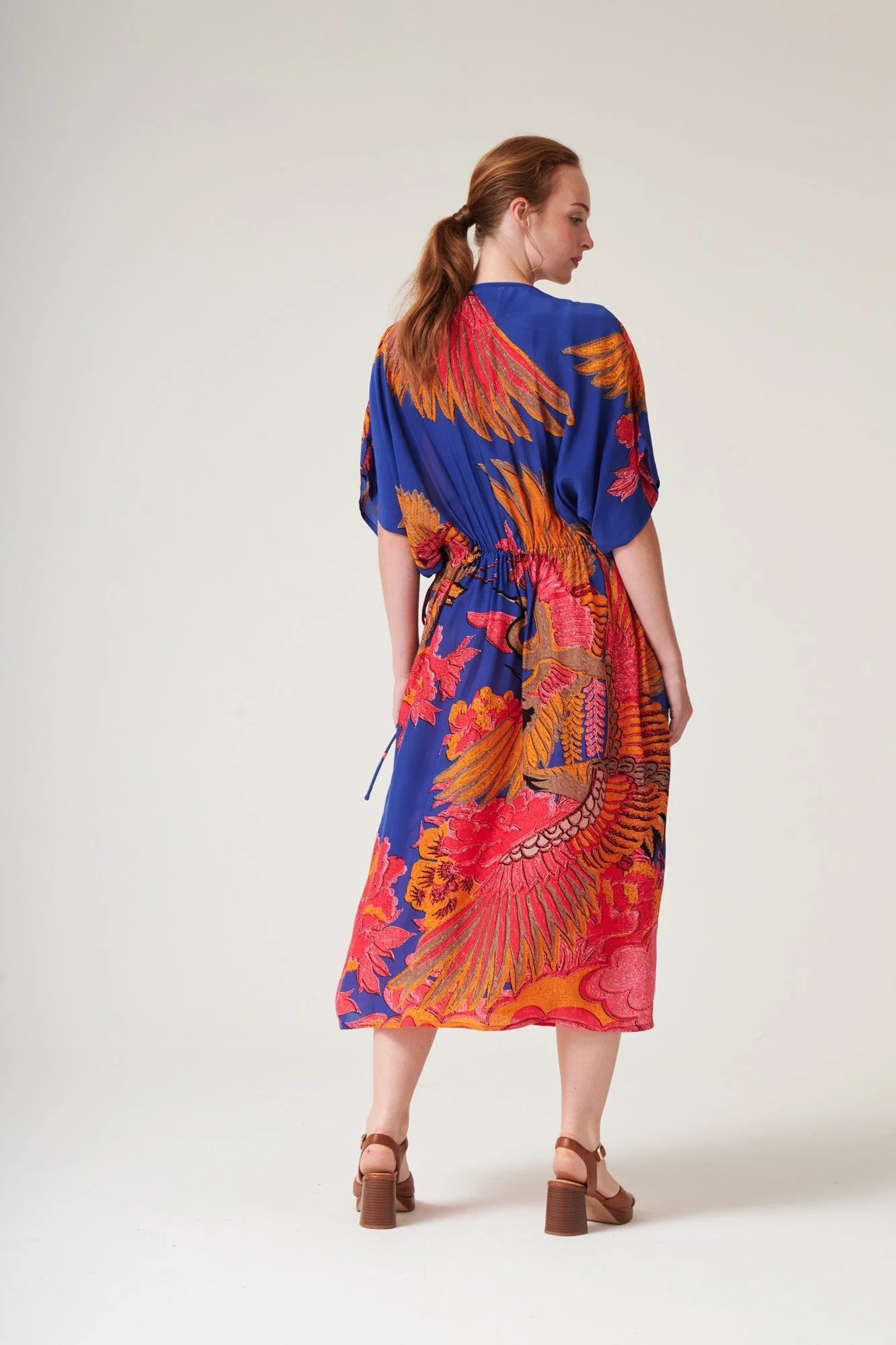 The crane symbolises good fortune in many cultures, and this vibrant print is undoubtedly something to celebrate! Featuring a bold background adorned with elegant birds in clever colour combinations. The pinks and oranges on the crane contrasting with the stunning cobalt blue background will make the wearer smile!