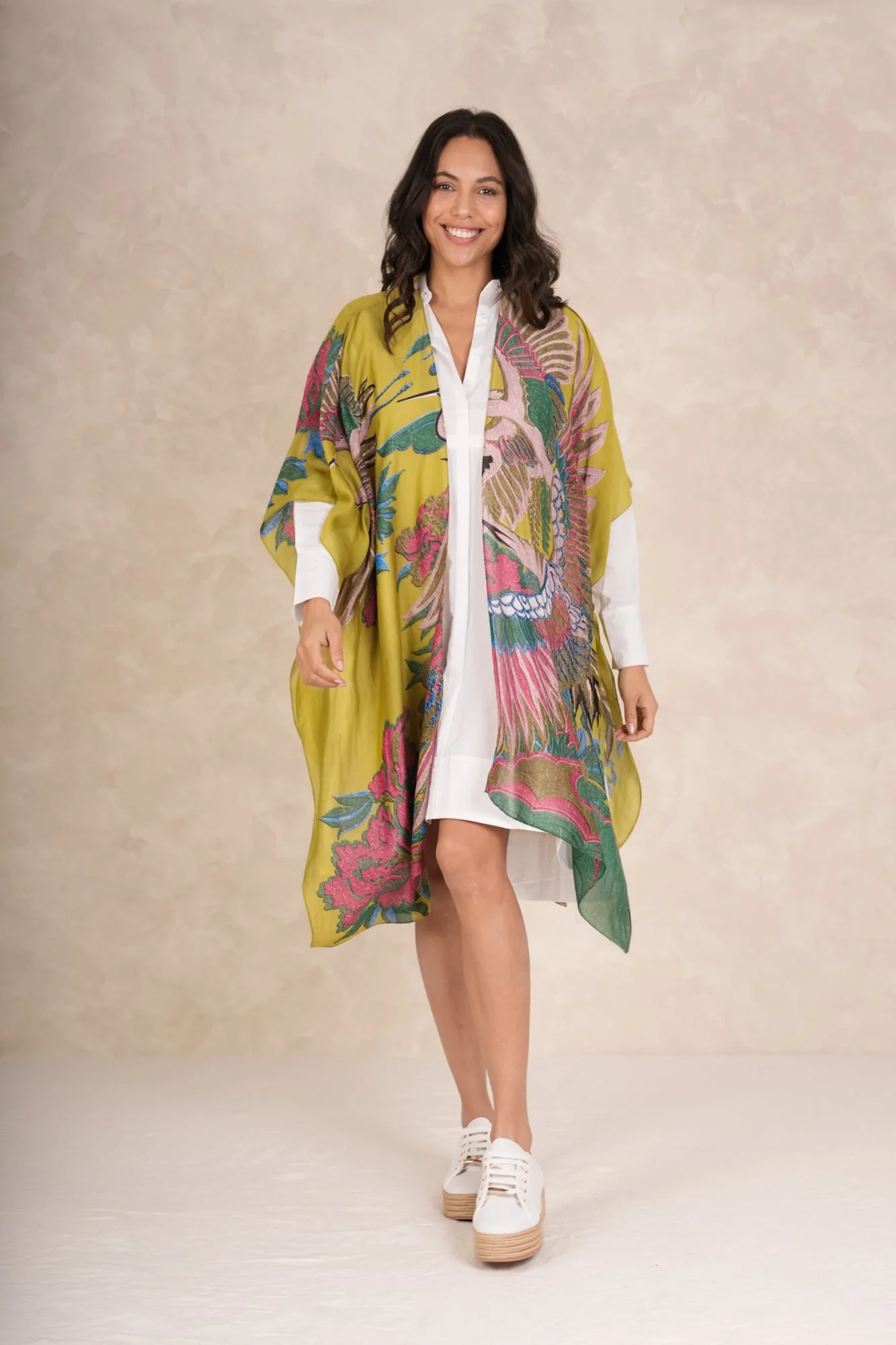 The crane symbolises good fortune in many cultures, and this vibrant print is undoubtedly something to celebrate! Featuring a bold background adorned with elegant birds in clever colour combinations. The green, blue, and pink on the crane set off against the rich olive background will make the wearer smile.