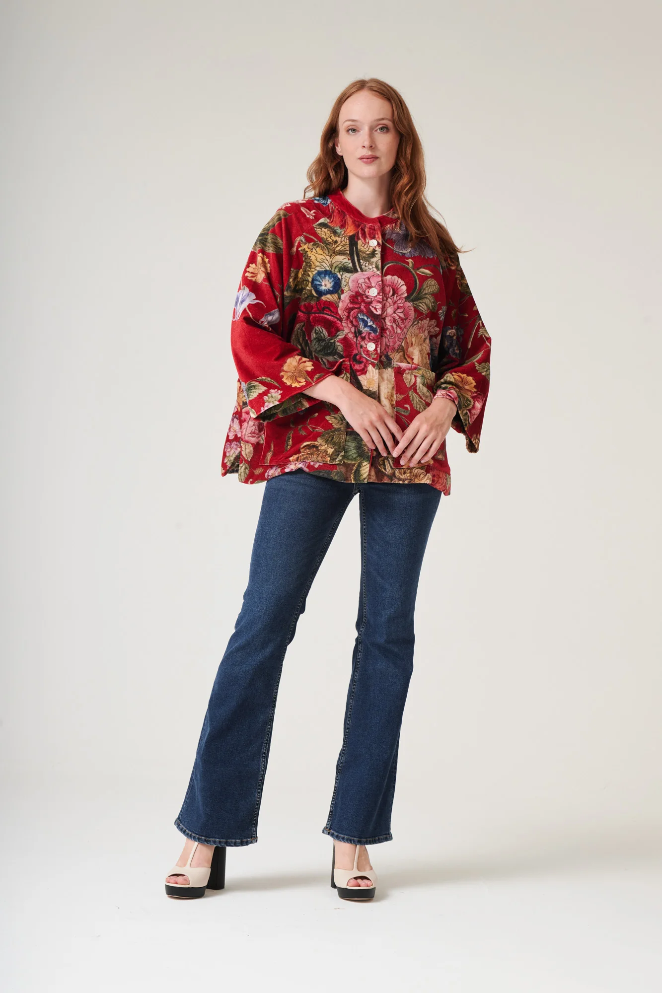A beautiful soft, short velvet jacket. With a mandarin collar, patch pockets, mother of pearl buttons, and loose-fitting ¾-length sleeves, this jacket will be a staple piece to take you through the cooler months.